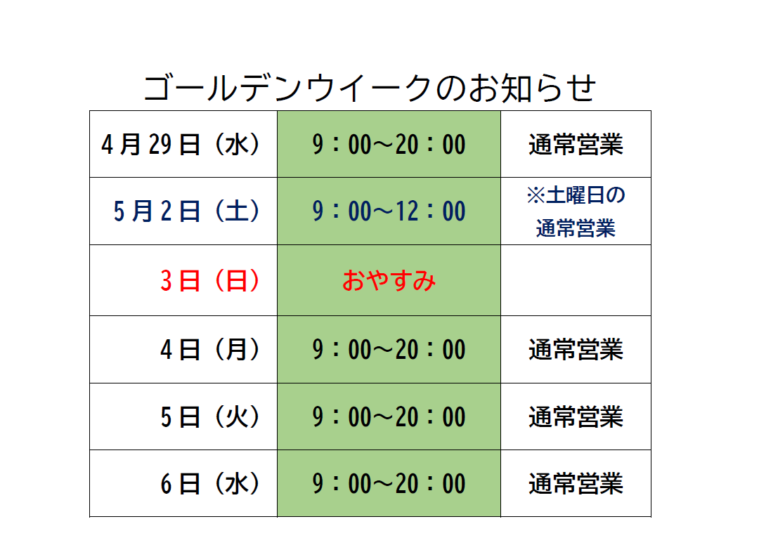 | 営業時間 | 9:00~20:00(土曜は9:00~12:00) ※祝日 9:00~20:00 |